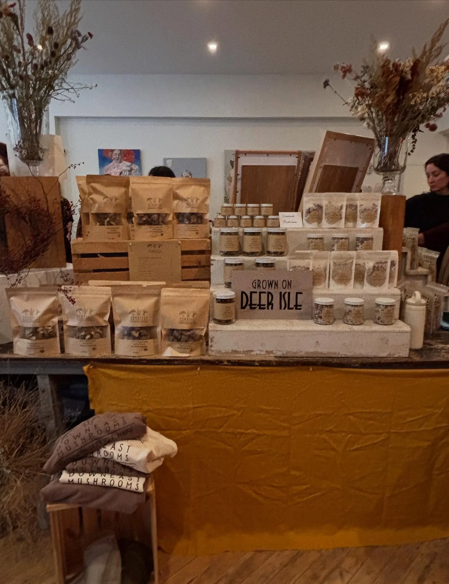 In our up-cycled shipping container on an island off the Maine coast, each harvested mushroom batch goes direct to market or transforms into our value-added mushroom delights.